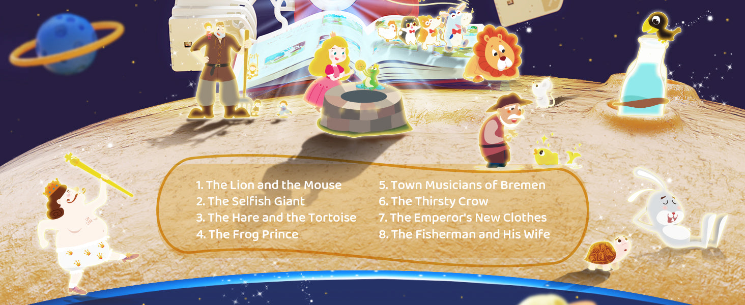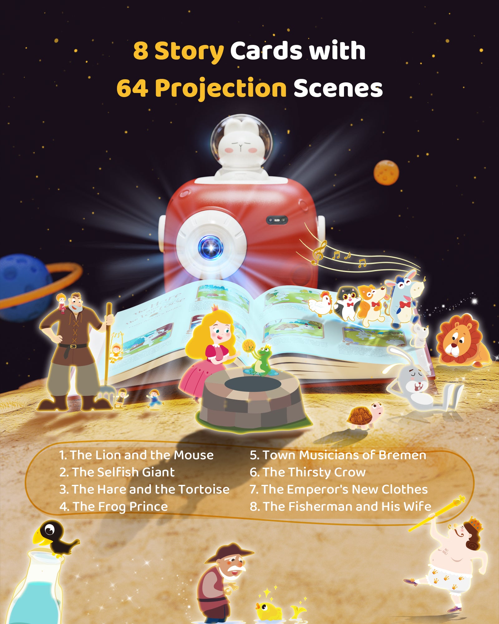 THIS HAS TO BE THE CUTEST THING I HAVE SEEN IN KIDS TOYS! YOU PLUG IN THE LITTLE CHARACTER ON TOP OF THE MACHINE, INSERT THE STORY AND HE SAYS, "HELLO, I'M YOUR FRIEND RABBIT. LOADING STORY." ONCE THE STORY HAS LOADED WHICH TAKES ONLY A FEW SECONDS THE STORY AND PROJECTOR START. THEY HAVE THE CUTEST DARN VOICES TELLING THESE STORIES. I'M A 60 YEAR OLD GRANDMOTHER AND I REALLY WANT ONE FOR MYSELF!